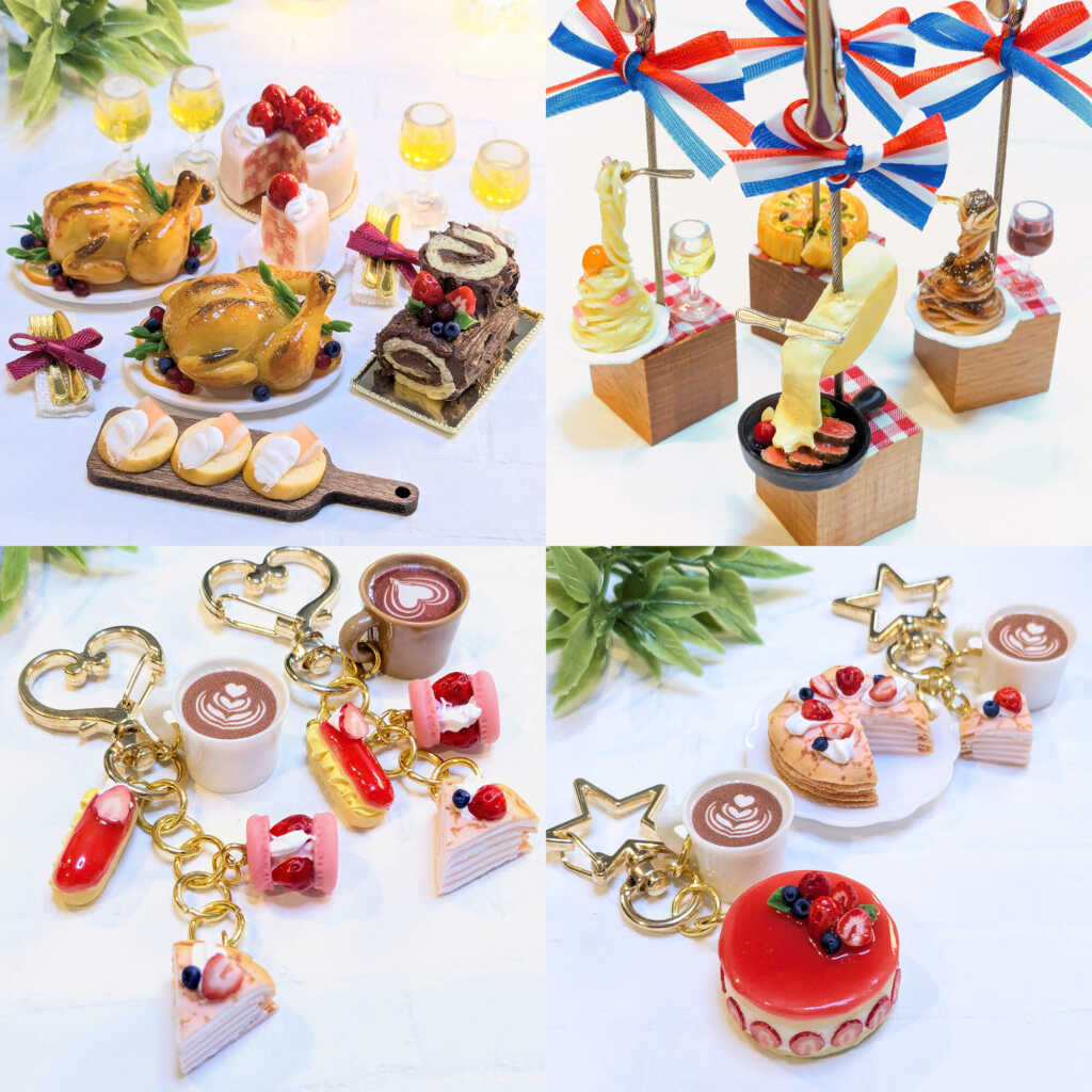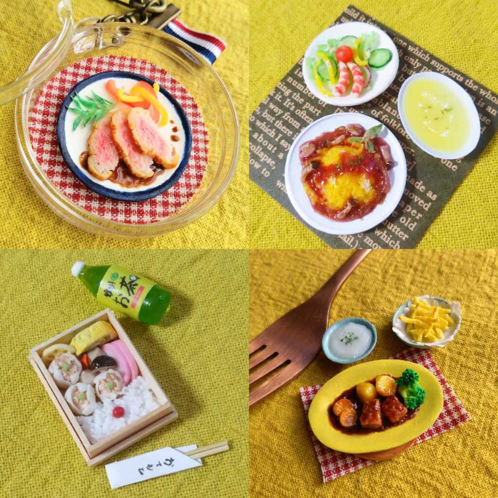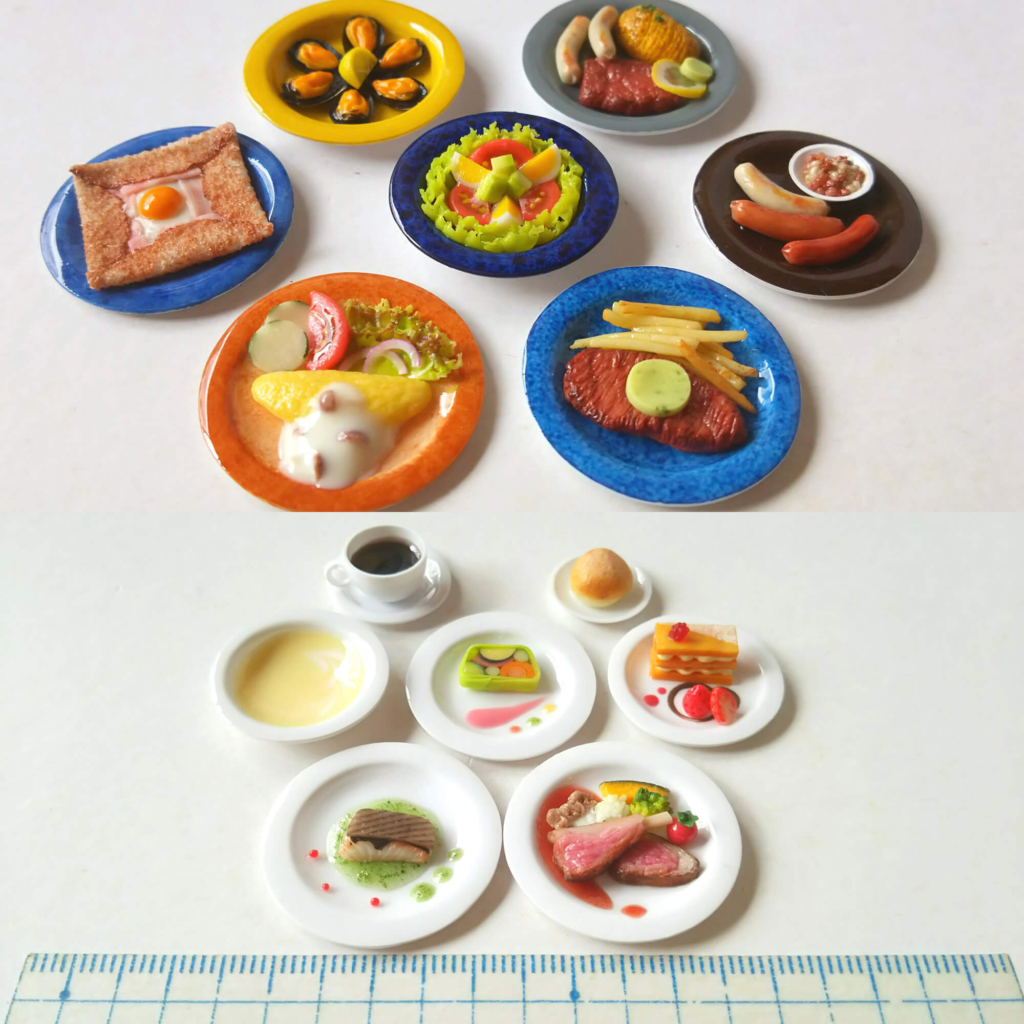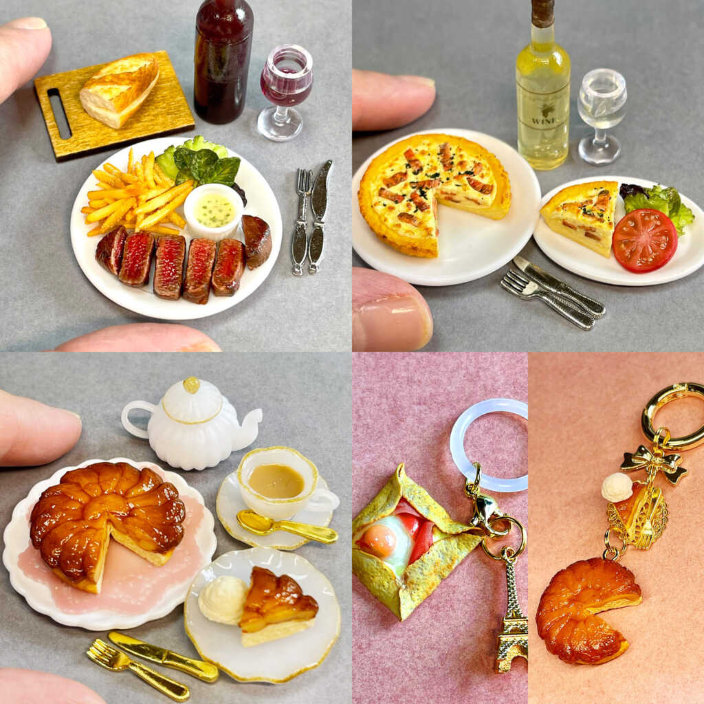 湯気まで感じられそうな温かな料理や、思わずワインを合わせたくなるような一皿が、手のひらサイズで丁寧に再現されています。