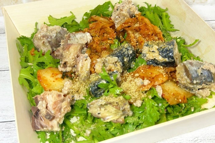 キムチには、塩辛、にんにく、生姜などの調味料が使われて味付けされているのでドレッシング代わりに。ごま油とすりごまだけでもバッチリ!