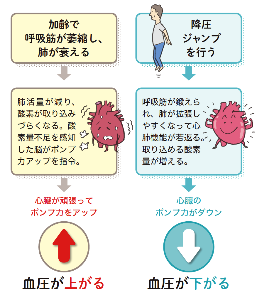 降圧ジャンプでは、こうした硬く動きの少ない形状を記憶してしまった呼吸筋にアプローチします。胸を広げながらジャンプをすることで、呼吸筋を伸ばしつつ、心肺機能を上げる運動によって肺機能を活性化。肺活量が上がれば酸素を送り届ける力が高まり、心臓も過剰に働かなくてすみます。血圧が自然に下がるだけでなく、同時に足腰も鍛えられるという、一石二鳥の降圧運動です。