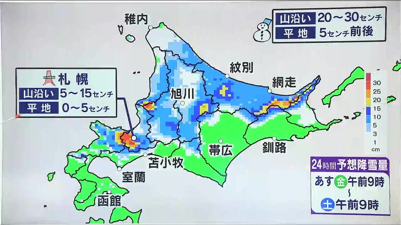 千歳で土曜の朝まで雪が降りますが、交通に影響が出るほどではないでしょう。その他は土曜もカラッと晴れて、寒さが続きます。火の取り扱いも注意して下さい。