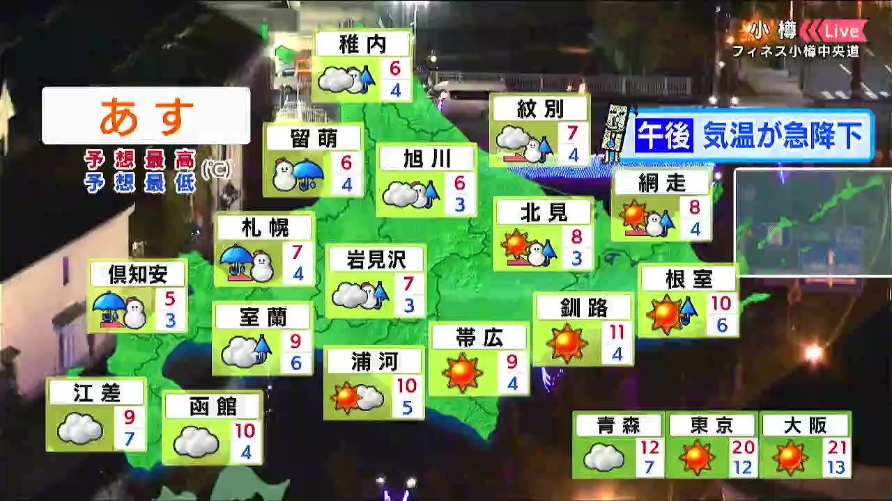 札幌や倶知安は朝から雨で、午後は雪に変わります。千歳や苫小牧も夕方以降は雪が降りそうです。夜は路面凍結にも注意して下さい。