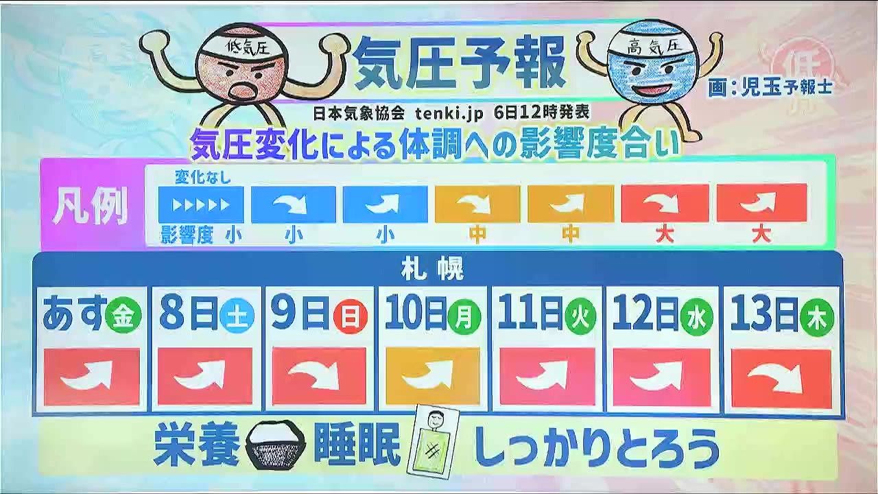 こちらは札幌の今後1週間の気圧予報です。赤色ほど気圧変化による体調への影響度合いが大きくなり、矢印は気圧の上がり下がりを表しています。