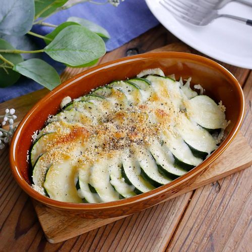 2: 耐熱容器にズッキーニを並べを全体にかけます。
