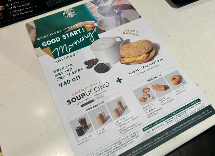 しかもまたこれが、食事によく合うのだ。ちなみに同日より、スタバのモーニングサービスがリニューアルしている。対象のドリンクと対象のフードを同時購入で、店内価格税込み40円分を値引きしてくれるとのこと。