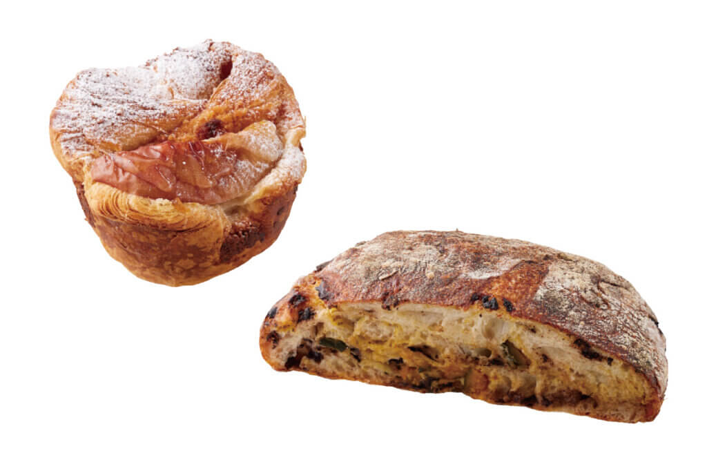 左/リンゴとキャラメルの風味がマッチしたキャラメルりんごのデニッシュ(398円)。 右/カボチャの優しい甘さが広がるカボチャとチョコレートのパンドロデヴ(398円)。