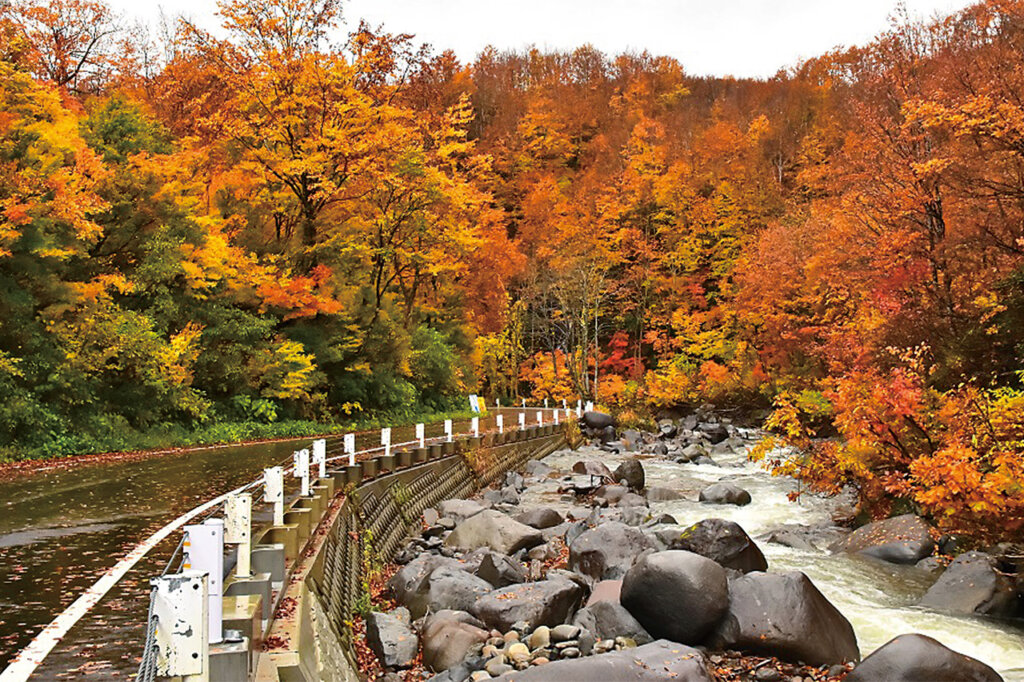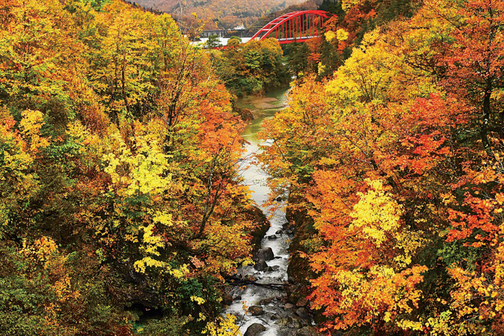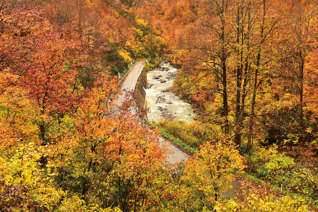 旧入広瀬村に位置し、魚沼市と福島県の県境に近い隠れた紅葉の名所。渓谷沿いに道路があり、ブナの原生林やカエデなどのさまざまな樹木が並ぶ美しい光景を車窓からも楽しめる。