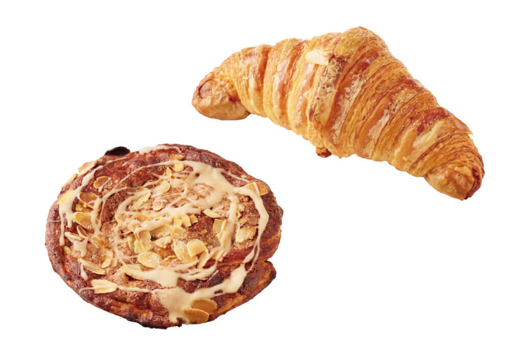 左/ヘーゼルナッツなどをクロワッサン生地で巻いたヘーゼルナッツの切り株シナモン風味(313円)。 右/クロワッサン(210円)は北海道産小麦と発酵バターを使用。
