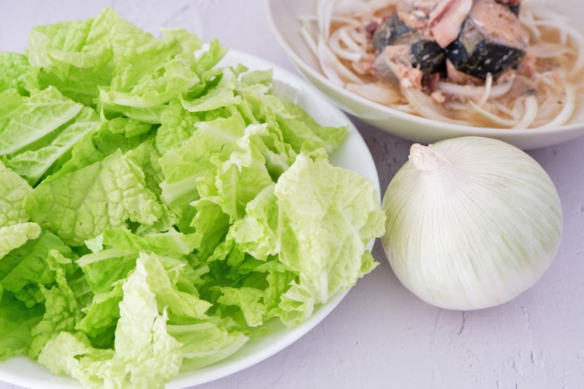 今回は白菜をプラスしてみました。サバ缶+玉ねぎ+白菜で炒め物を作ってもいいですし、スープにもアレンジができます。