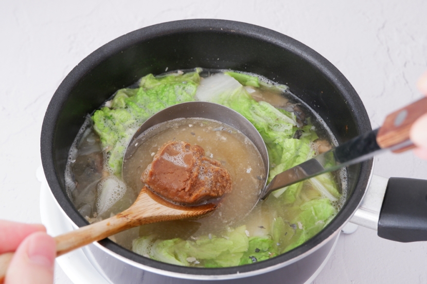 玉ねぎと白菜から野菜の甘みも溶け出して、ホッとする味わいです。さらに、豆腐、ねぎ、油揚げなど食材を足していけば、具だくさんの味噌汁にグレードアップしていきます。