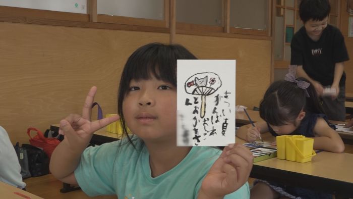 児童は、夏にちなんだうちわやスイカ、かき氷などの絵をはがきに描き、家族や友達あてにメッセージを添えました。