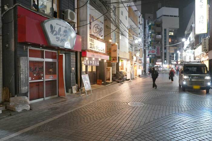 立川駅南口の、『立川やきとん』や『ギョウザバーりん屋』などの大衆居酒屋がひしめく通り。
