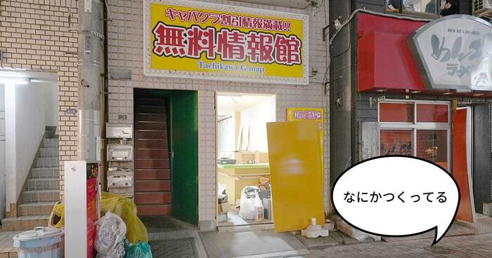 その通りぞいの、以前『無料情報館』だったところで、何かをつくっている様子が見られました。