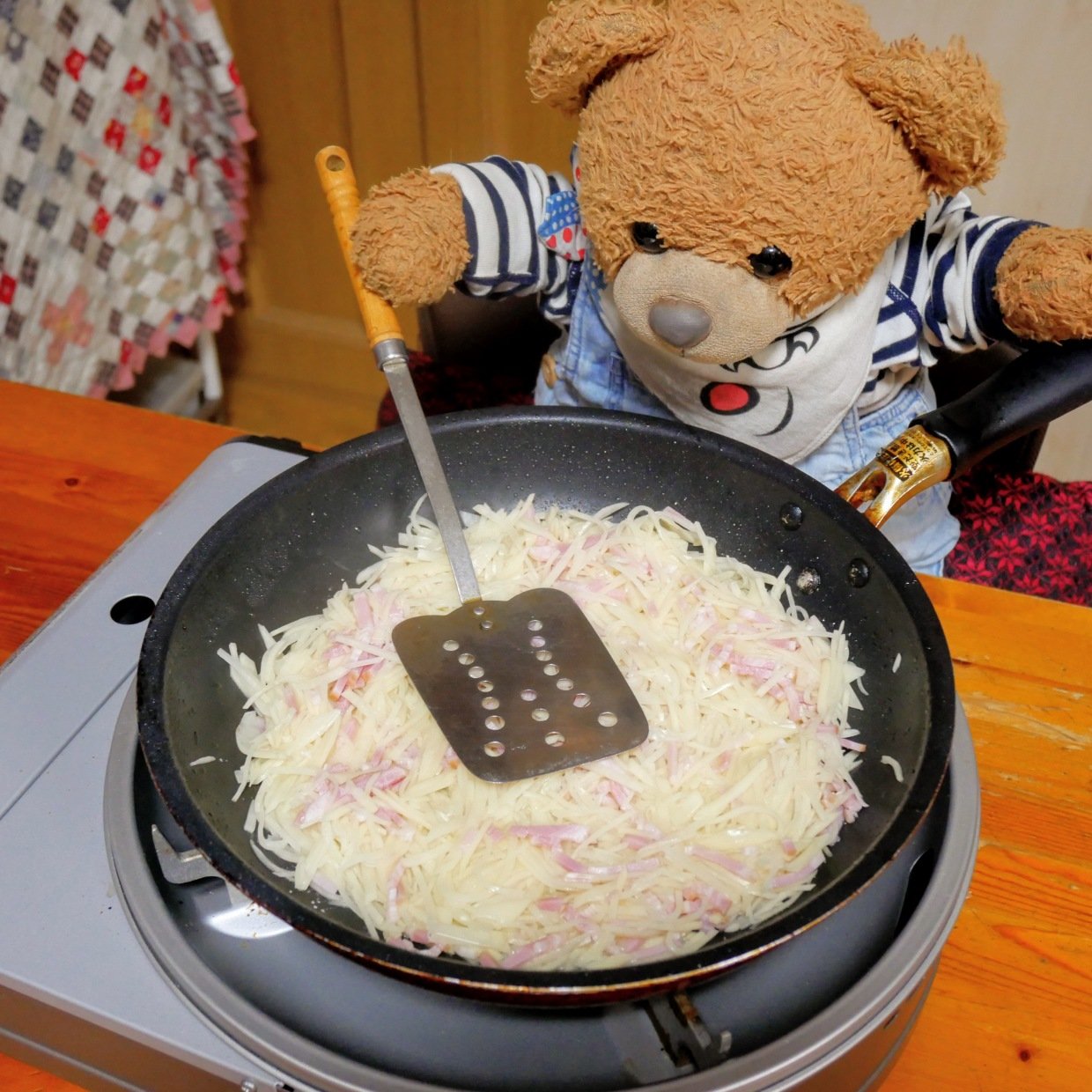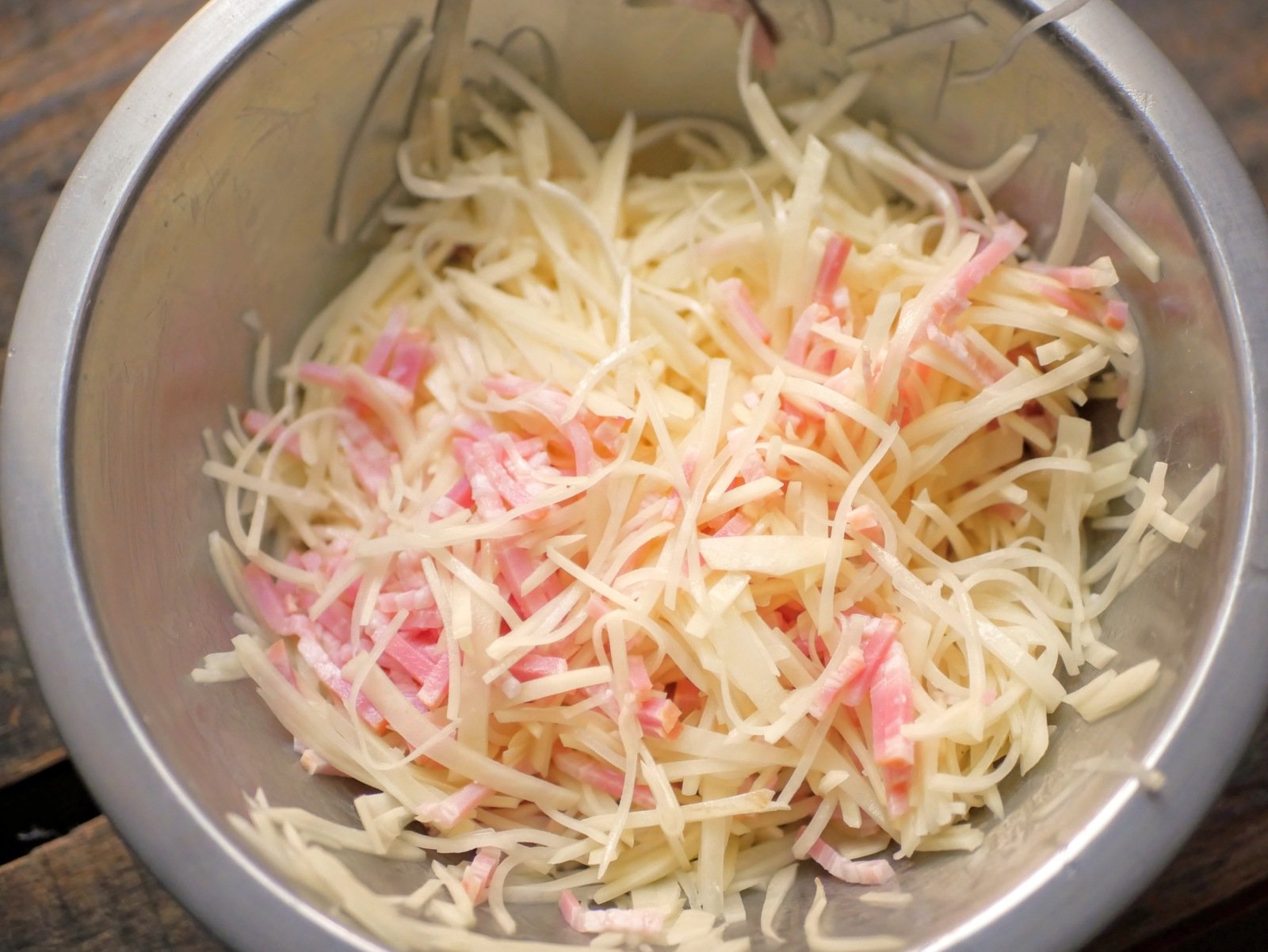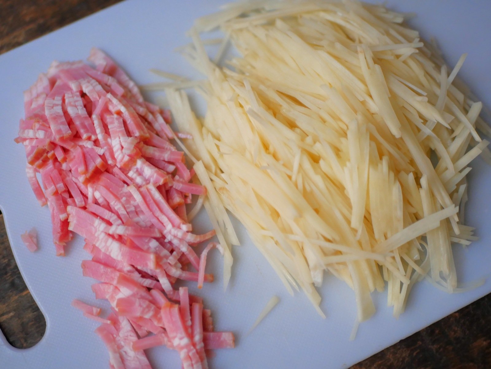 1. じゃがいもは皮をむいて千切りにする。できるだけ細い千切りにするよ! ぼくはスライサーでスライスしてから包丁で千切りにしているよ。