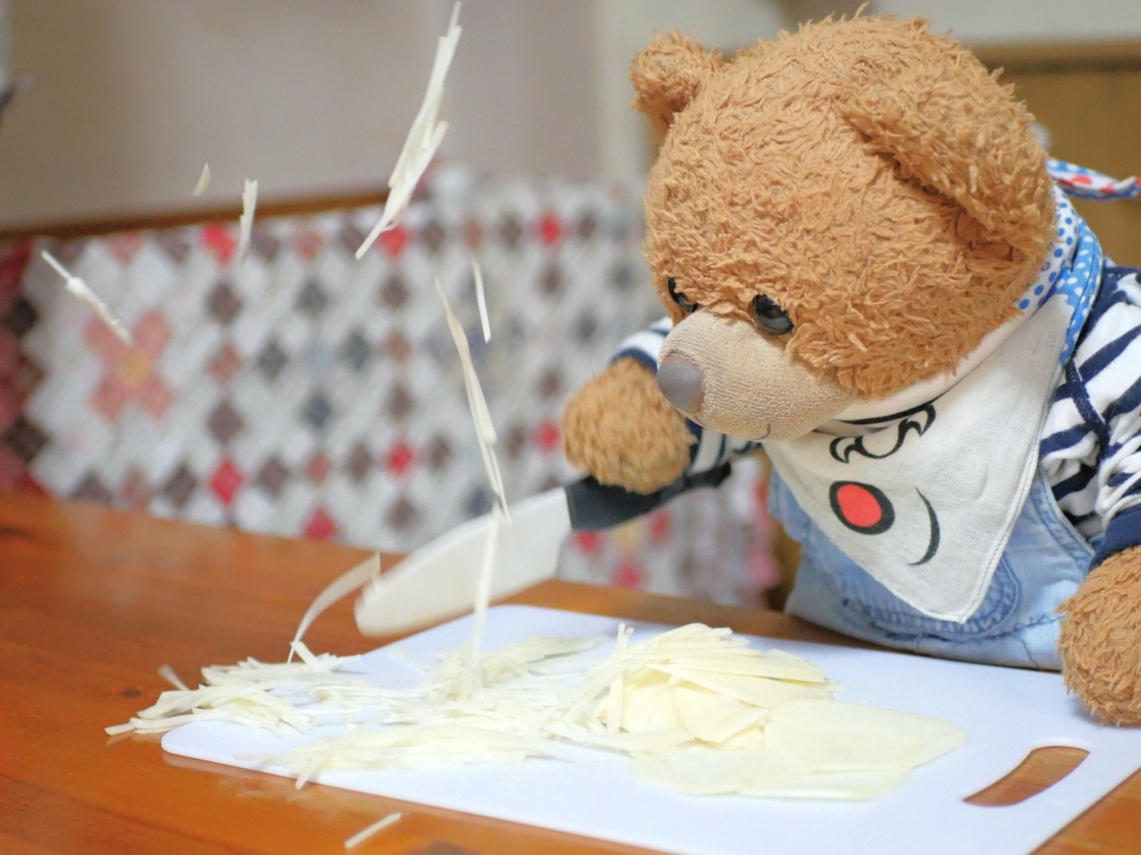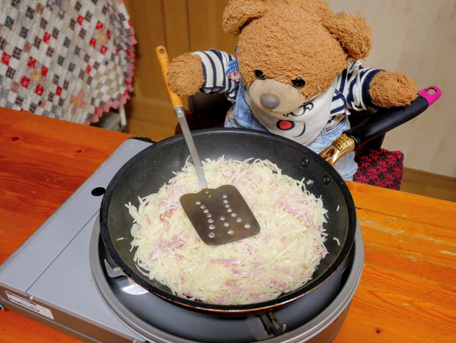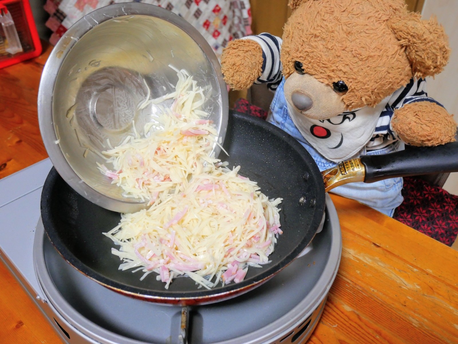 1. じゃがいもは皮をむいて千切りにする。できるだけ細い千切りにするよ! ぼくはスライサーでスライスしてから包丁で千切りにしているよ。