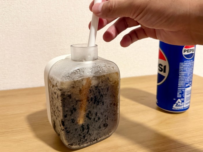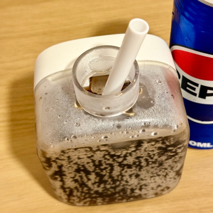口コミにあった液漏れを心配していたが、とりあえず大丈夫っぽい。まあ結露はある程度仕方ないだろう。もちろんキンキンに冷えたペプシは最高にウマい!