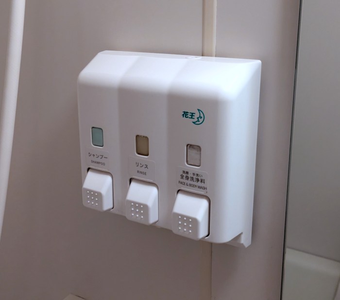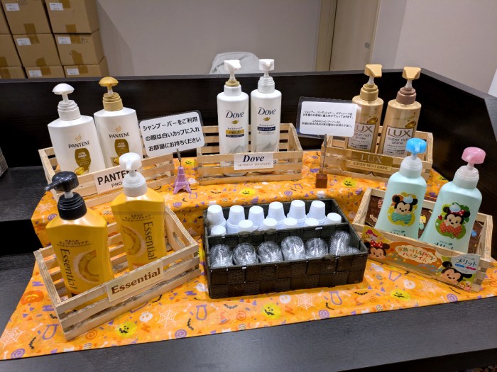 ということで、宿泊当日にチェックインしてカードキーを受け取り、部屋に行こうとしたところ、エレベーター前にシャンプーバー発見。もしかして、部屋にシャンプーもボディーソープもないのかな? 仮にそうだしても、私は納得する。だって料金が安いから、セルフでも全然不思議じゃない。