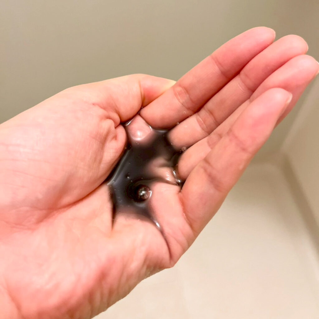 パッケージだけでなく、クレンジングオイルも黒い!これは炭・吸着泥などの4種の毛穴対策成分を配合によって、黒くなっているそうです。炭などが入っているのでスクラブのようにつぶつぶしているのかな?と思いましたが、実際のテクスチャーはさらりとしたオイルでした。