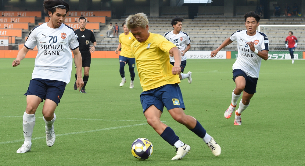沼津の決勝点は前半42分。左サイドバックのDF宮脇茂夫選手の左クロスをファーサイドでMF遠山悠希選手が合わせました。遠山選手は「得点が一番のアピールで、自分が求めていた部分。リーグ戦でも同じような形があり、クロスがいいボールで合わせるだけだった」と振り返りました。