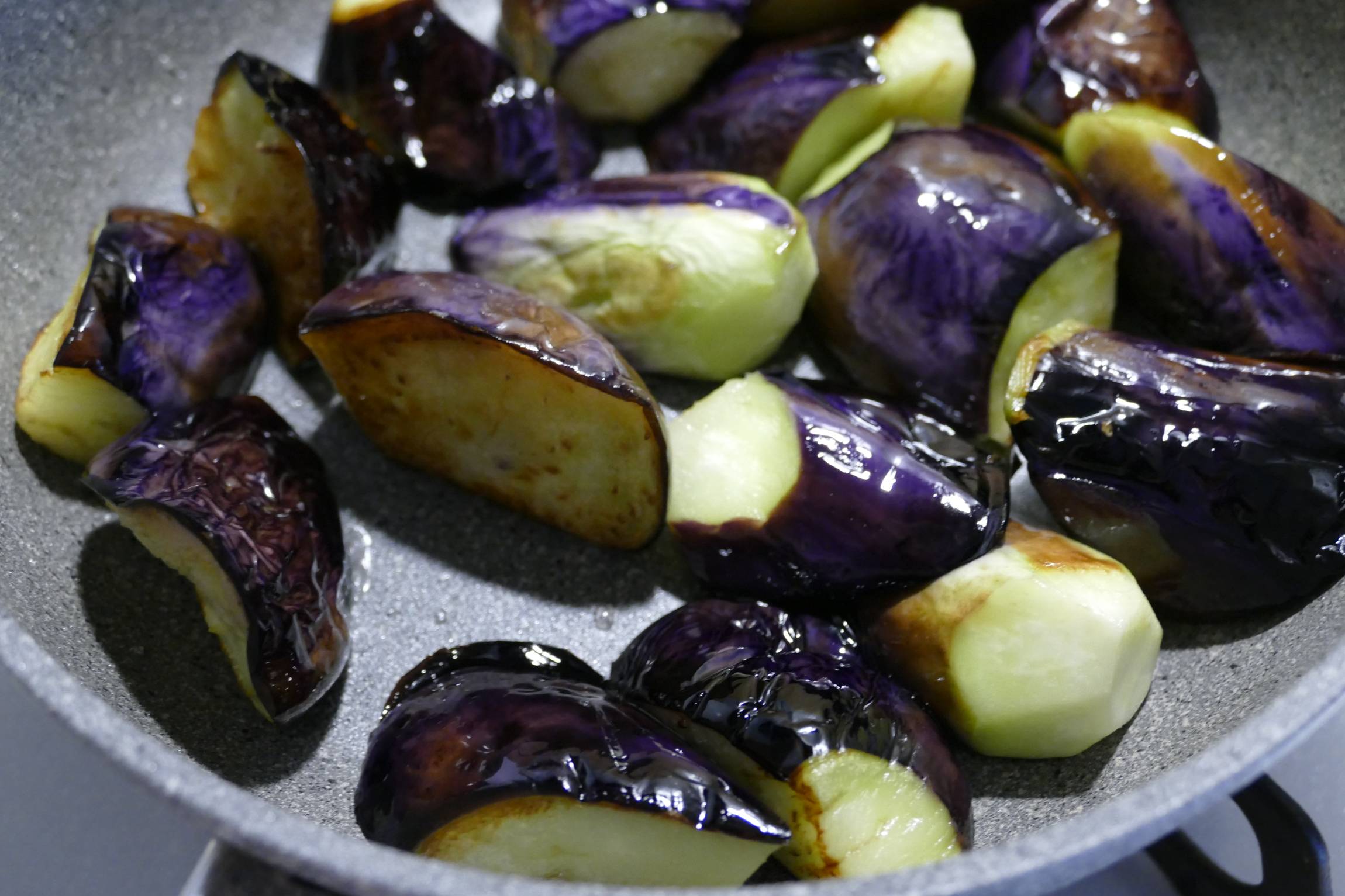 なすの断面に焼き色がついたら弱めの中火にし、なすから余分な油が出てくるまでじっくり焼きます。なすがやわらくなったら火を止めます。