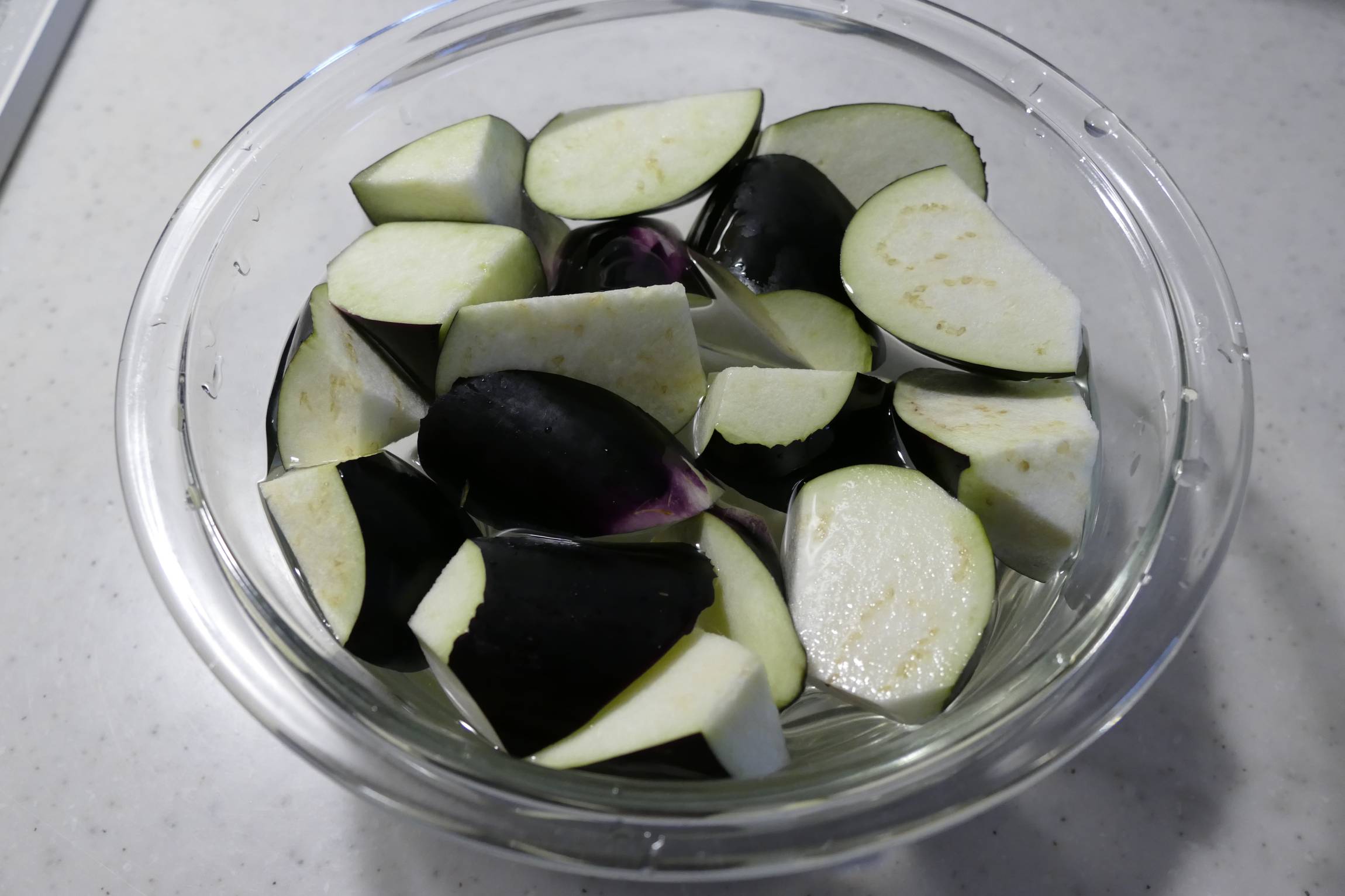 なすを塩水に浸してあく抜きをし、色鮮やかに仕上げる