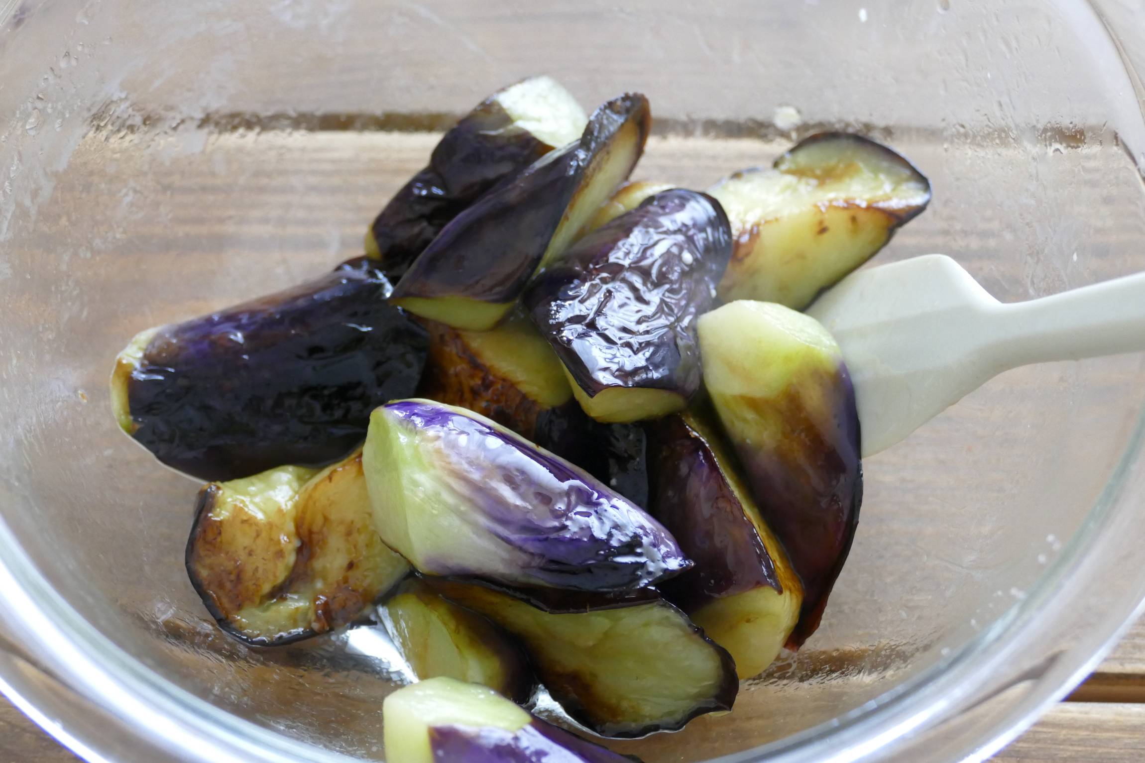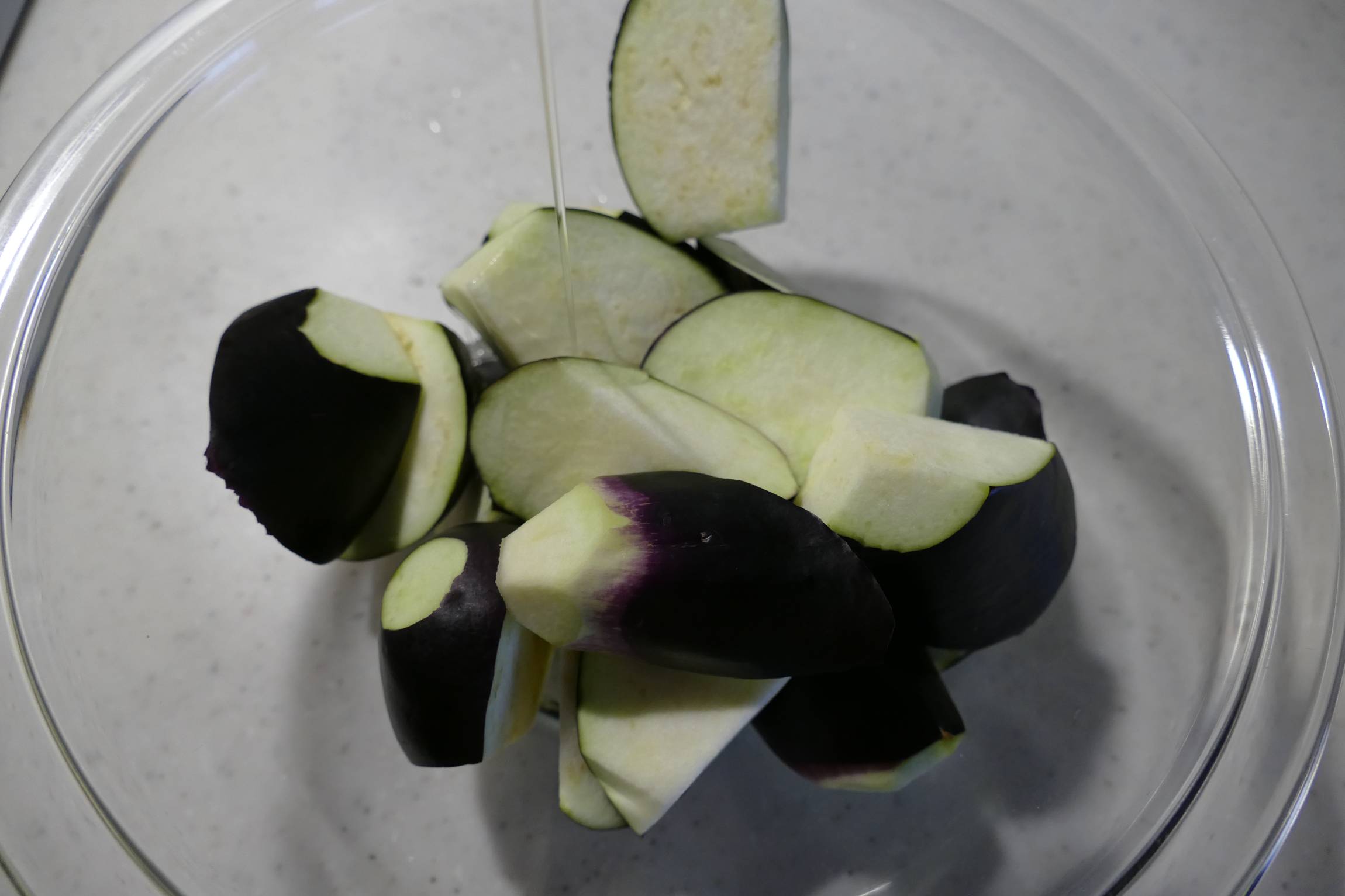 加熱前のなすに油を絡め、なす全体に油がいきわたるようにする