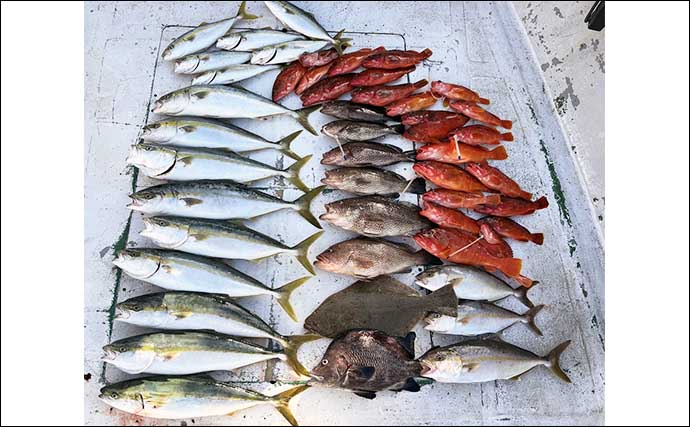 三重県度会郡大紀町の錦から出船している喜盛丸では、28日にレンタルボートを利用した人が3人でマダイ65cm、良型頭にオオモンハタ10匹、シオ3匹、イナダ5匹にアカハタなど好釣果。また、同日の半夜便ではマダイ85cmが上がり、アジも尺超えの大型が船中300匹以上の爆釣だった。なお、半夜便の夕マヅメは連日シオが絶好調。