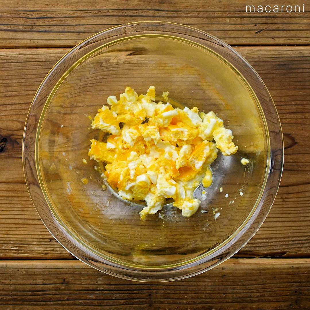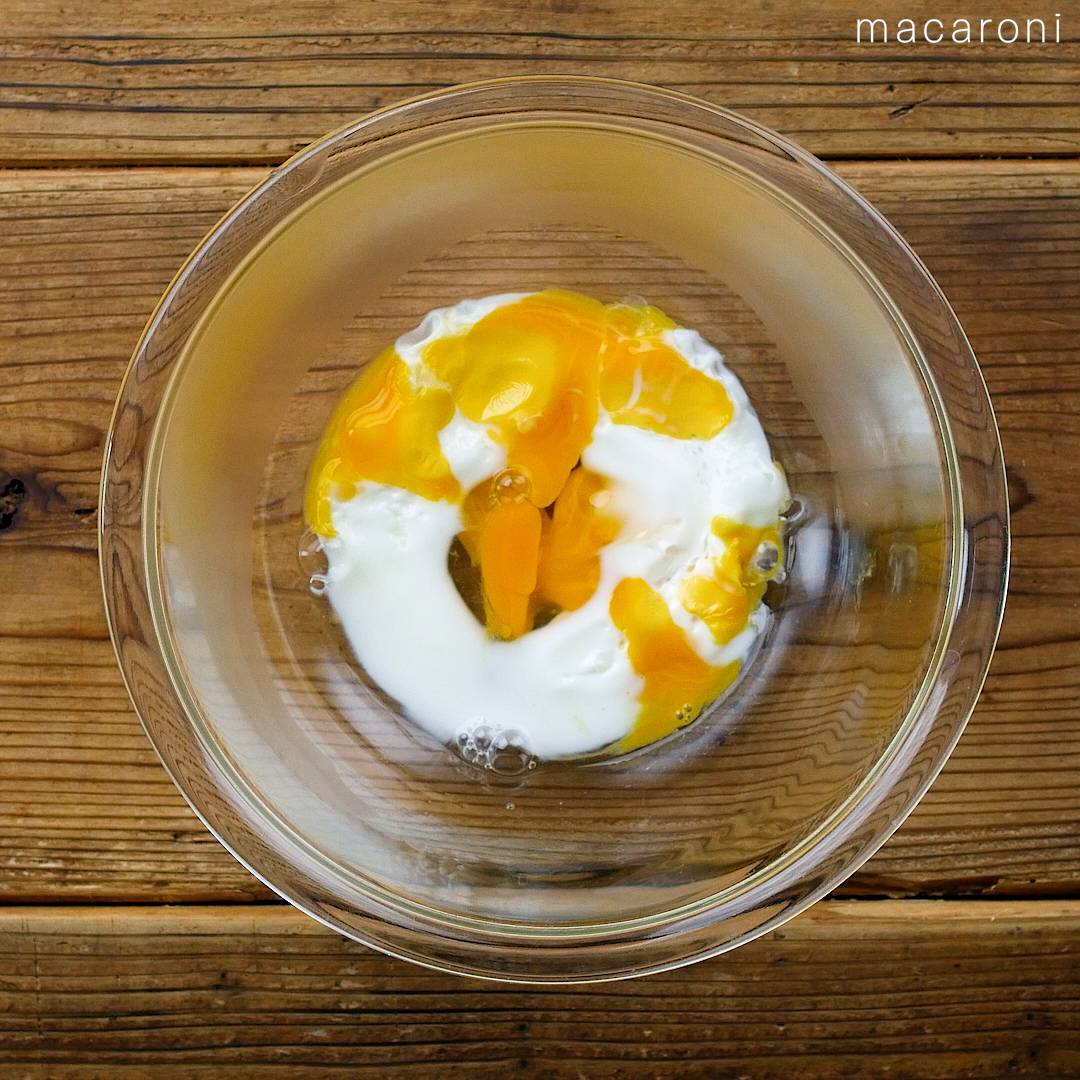 2: ボウルに卵を割り入れ、軽く溶きほぐしたら、そのままレンジ600Wで30秒加熱します。