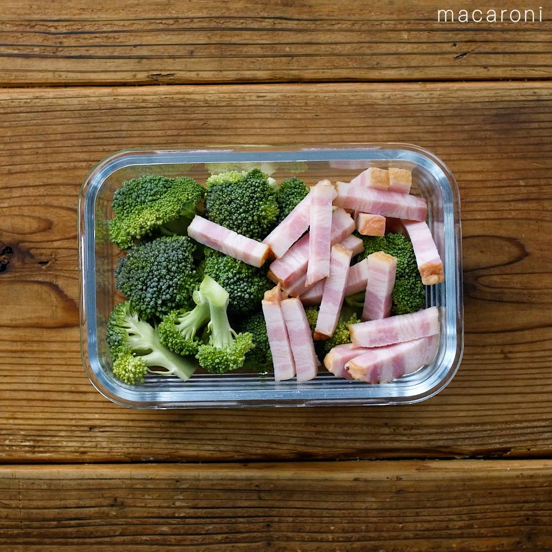 1: 耐熱ボウルにブロッコリー・ベーコンを入れてふんわりラップをかけ、レンジ600Wで2分加熱します。