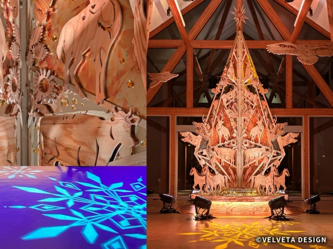 『道の駅ガーデンスパ十勝川温泉のからまつコリドー』には、イベントを象徴するシンボルツリーがあり、温かみのある琥珀色にきらめいて、訪れる人たちの心をホッとあたためます。今年は、エントランスからからまつコリドーまで光の演出が広がり、館内にはウッド系の癒やしの香りを楽しめるフレグランス演出も新登場!