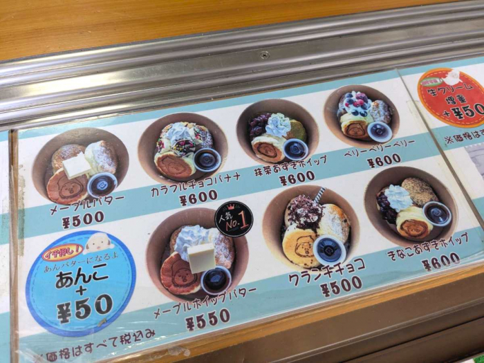メニューは「メープルバター」や「クランチチョコ」などの定番と期間限定のものがあり、取材時はシャインマスカットや栗、さつまいもを使ったパンケーキが提供されていました。