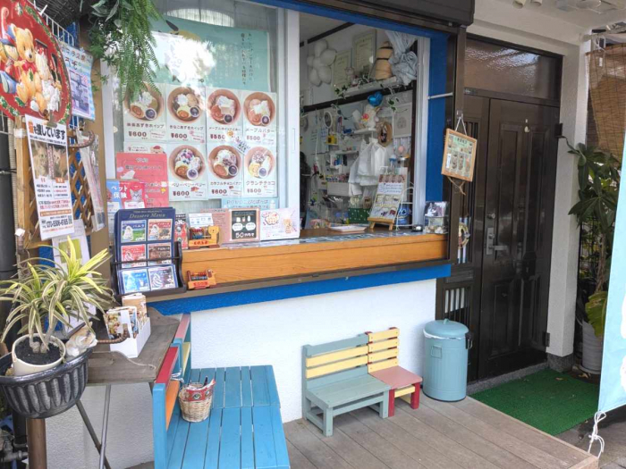 お店は市役所から徒歩約6分のところにあり、青と白のストライプ柄のひさしが爽やかな雰囲気。店先にはかわいい木製のベンチが設置されていました。