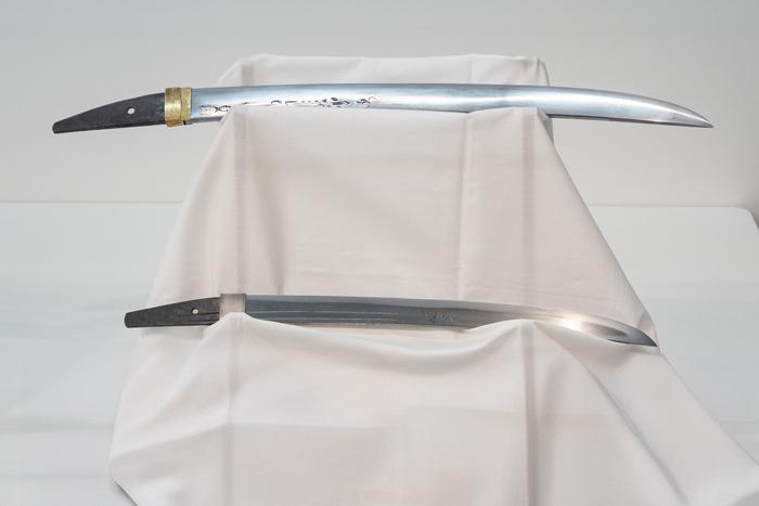 光に照らされると浮かび上がる美しい刃文。刀工の技と息遣いが伝わってきます。こちらは安土桃山時代の作品。