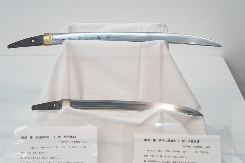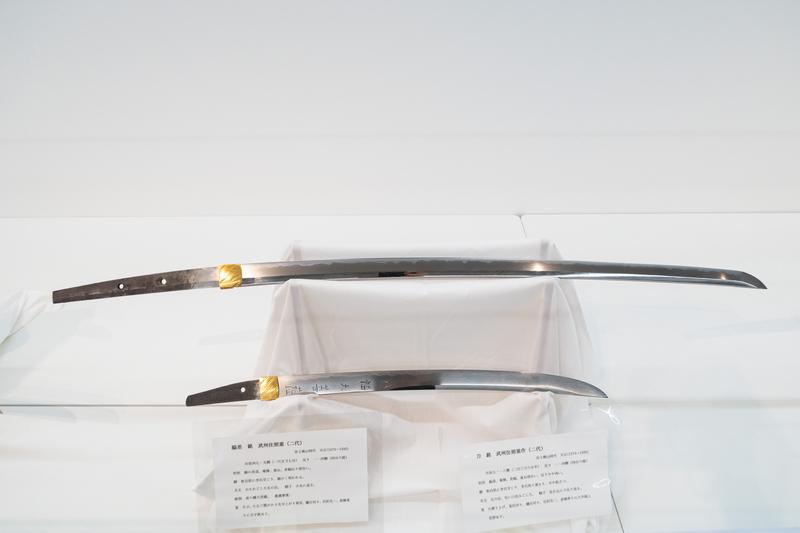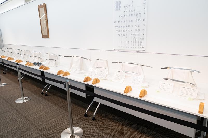 ケース越しに見ても伝わる迫力!刃文や反りの違いなど、作品ごとの特徴をじっくり眺められます。すべてが八王子ゆかりの刀工によるものです。