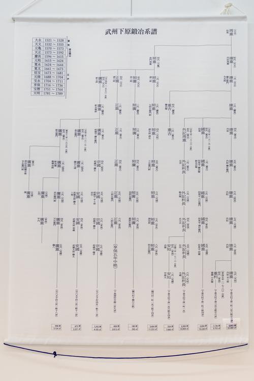 下原刀は、鎌倉以来の「相州伝(日本刀の作刀法)」の技を継いだ刀工たちが、小田原から八王子へ移り住んだことが始まりとされています。のちに北条氏がこの地を治めると、刀工たちは厚く信頼され、「康重」「照重」など主君ゆかりの名を授かりました。技と名跡が継がれた系譜は、会場の図で分かりやすく紹介されています。