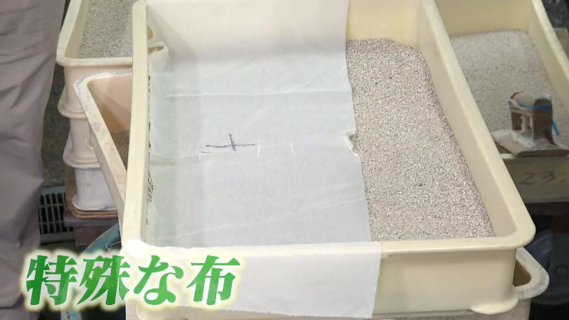 まず、砂を敷き詰めたトレイの上に特殊な布を敷きます。