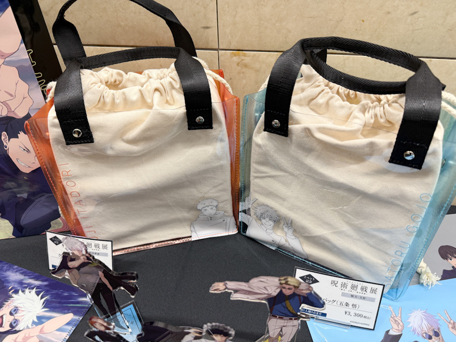 虎杖悠仁バージョンと五条悟バージョンの2種展開。外側はクリア素材、内側には巾着スタイルの布バッグがセットになった2層仕様。荷物をしっかり入る実用的なバッグ。3,300円