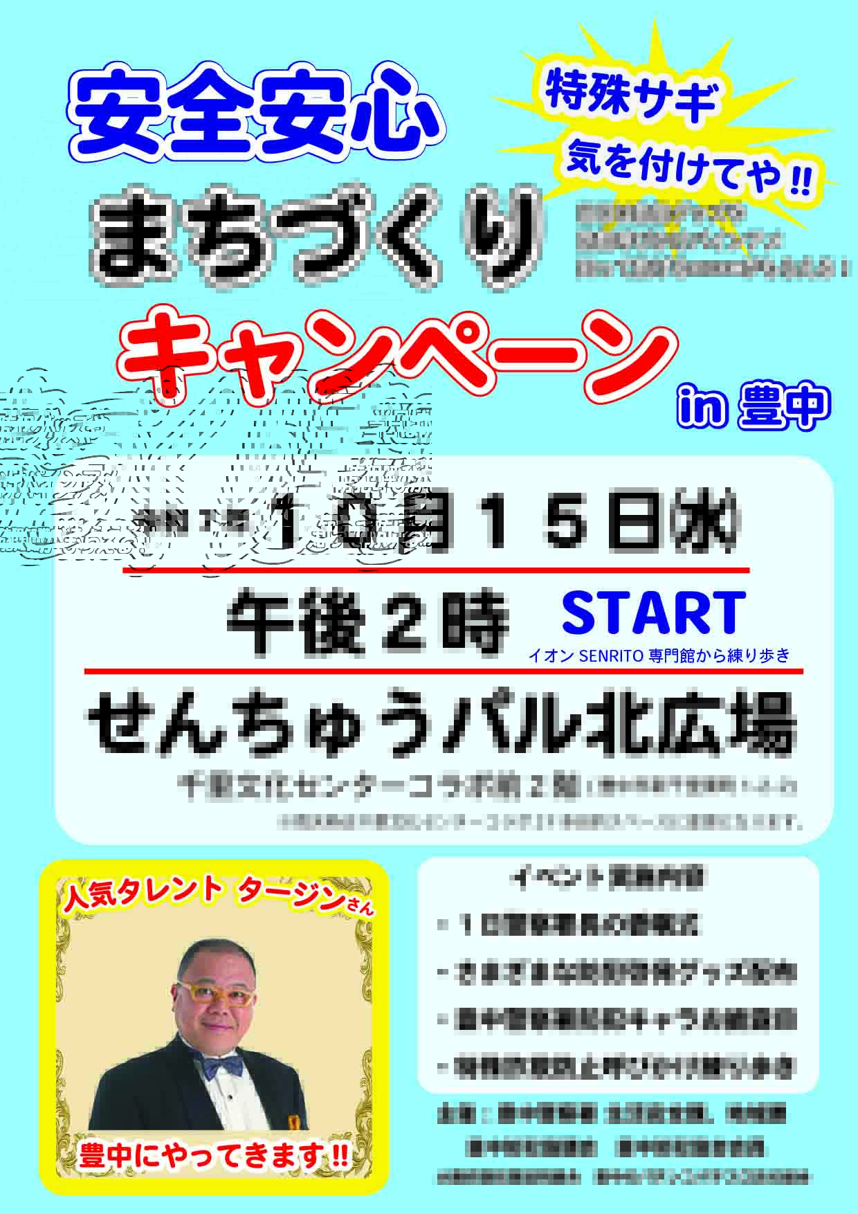 タレントのタージンさんがやってくるんだって/せんちゅうパルで「安心安全まちづくりキャンペーンin豊中」が開催されるみたい