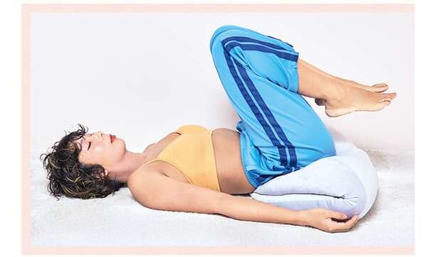 仰向けになり、バスタオル数枚やクッションなどを骨盤上部の下に入れ、脚を持ち上げます。お腹の筋肉を四方から縮めていきます。