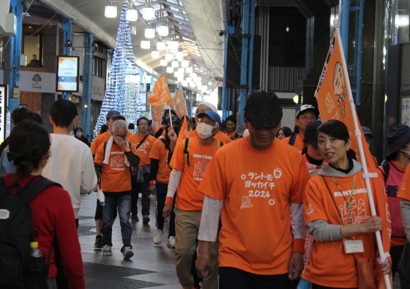 商店街のアーケードを行くオレンジ色の参加者たち