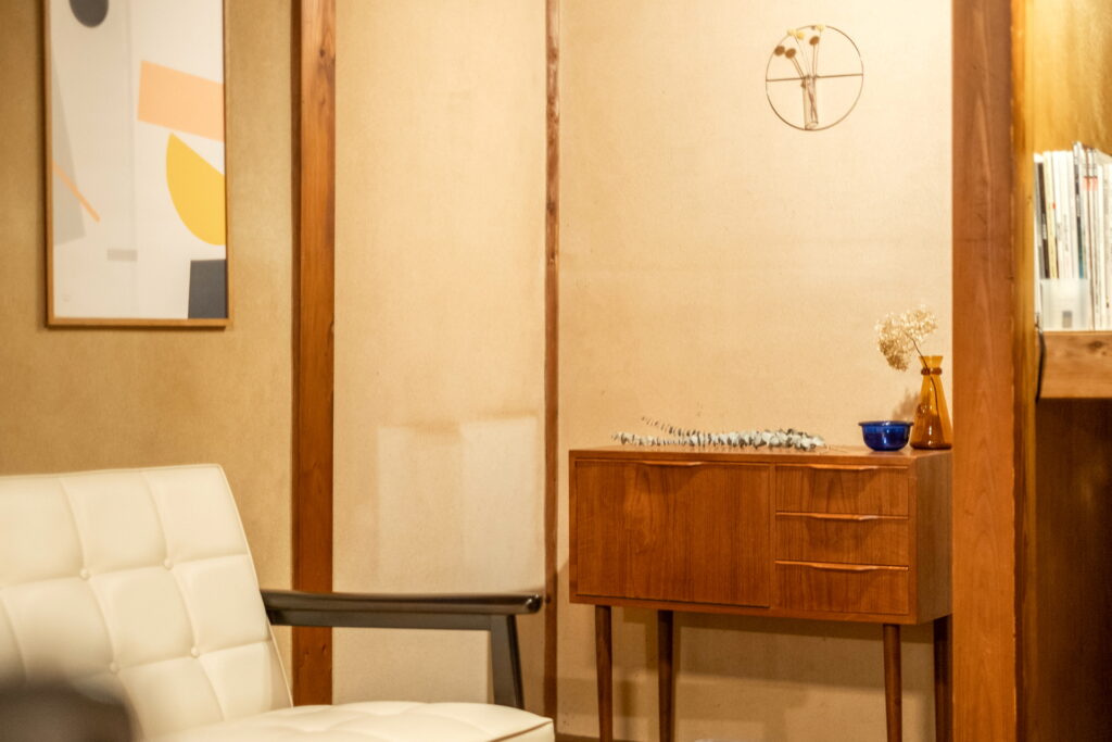一つのモノを象徴的に飾るとき、自分の視界の真ん中に置くのが一般的だと思いますが、あえて中心からずらして置くことで何となく雰囲気を感じる空間が生まれます。空間の「余白」もシーンの一部として印象付けることができるからです。