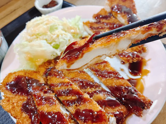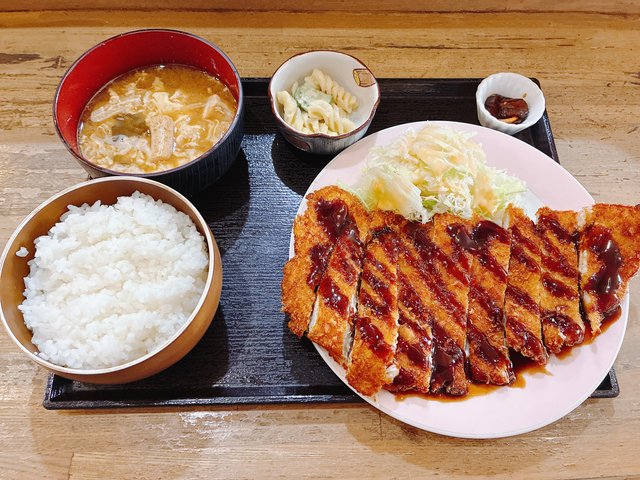 衣はザクザク、中のお肉は柔らかくてジューシー。たっぷりかかったソースがご飯を強烈に誘います。気取らない味、これぞ食堂のチキンカツです。