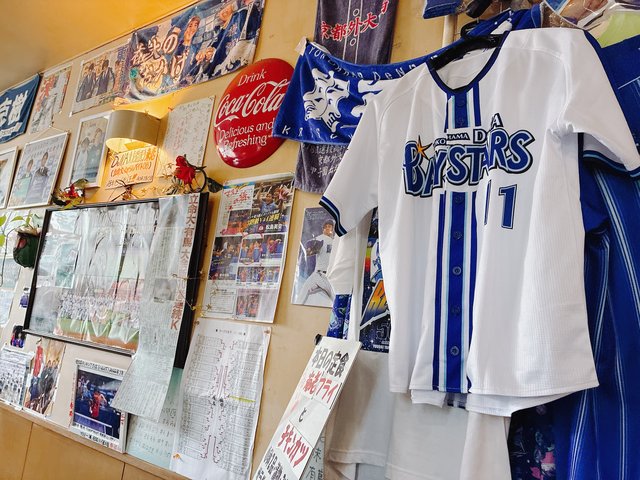 そして壁を見上げてびっくり。横浜DeNAベイスターズのユニフォームが飾られています。
