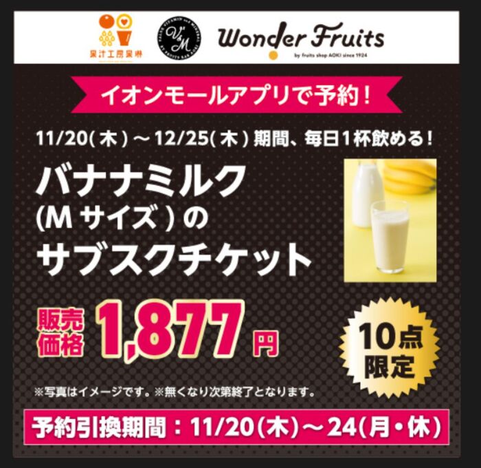 11月20日(木)~12月25日(木)の期間中バナナミルクが毎日1杯飲めちゃうサブスクチケット!↓