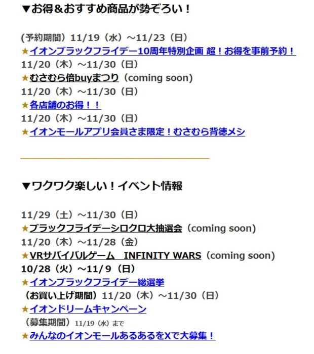 【お得情報まとめ】11月20日(木)~11月30日(日)はイオンモールむさし村山ブラックフライデー「超!BLACK FRIDAY」が開催