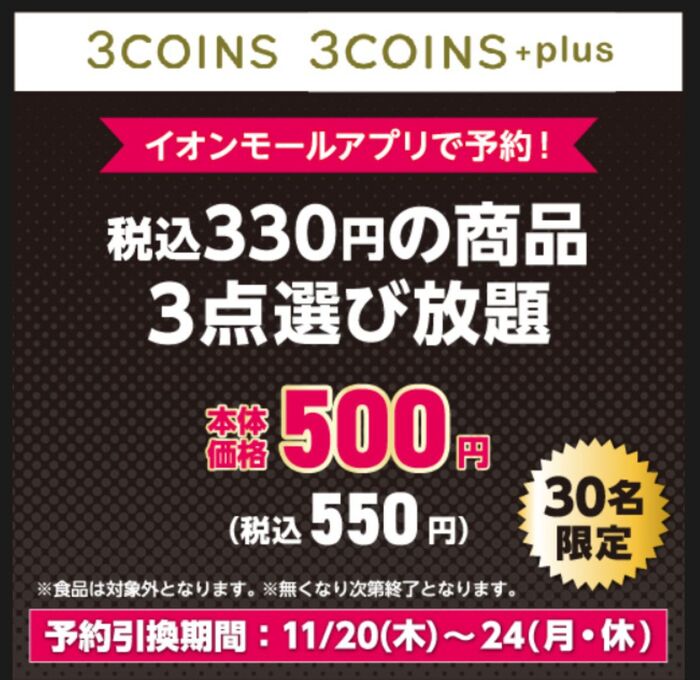 2階『3COINS+plus』からは税込330円の商品を3つ買っても990円⇒税込550円という太っ腹企画。