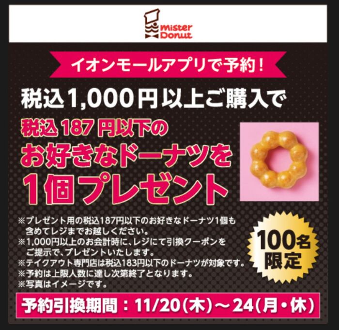 税込1,000円以上ドーナツを買うと税込187円以下のドーナツが1個おまけでもらえます。