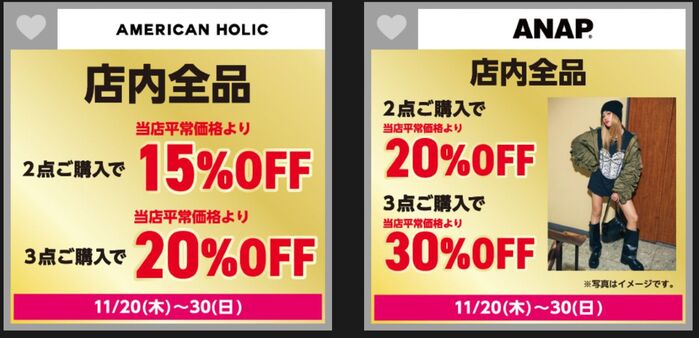 1階『アメリカンホリック』と2階『ANAP(アナップ)』では数点まとめ買いで15%~30%オフに。