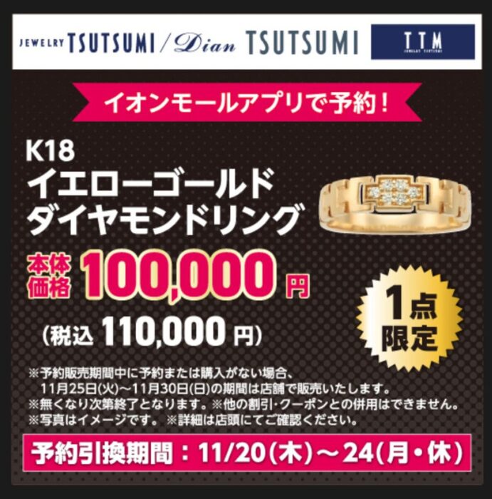 18金のダイヤモンドリングが税込110,000円。1点限定の早い者勝ちです。