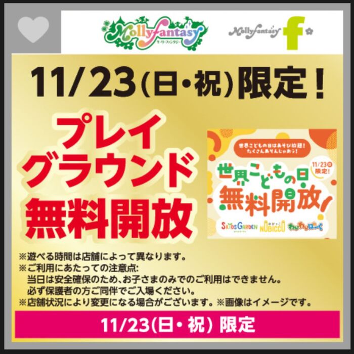 11月23日(日)限定で3階「モーリーファンタジー」のプレイグラウンド(スキッズガーデン)が無料開放されるそう。
