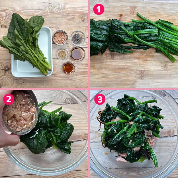 ほうれん草チンして、ツナ・塩昆布・めんつゆ・ごま油とサッと和えるだけ。